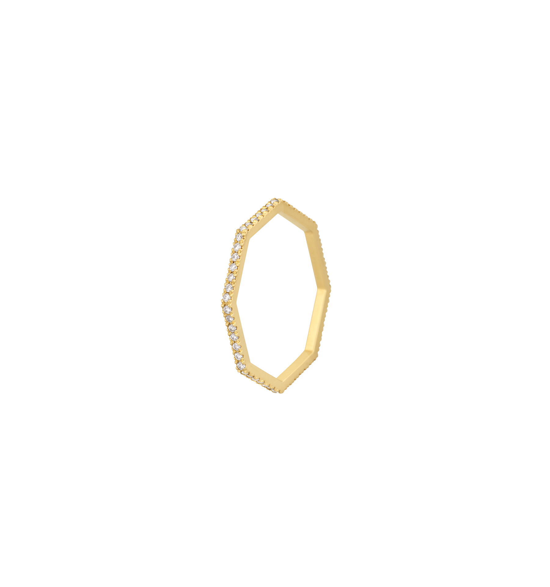 Crafted in polished gold and set with fine diamonds, this octagonal ring catches the light from every angle. Bold enough to wear alone, refined enough to stack — a modern classic with quiet glamour.
