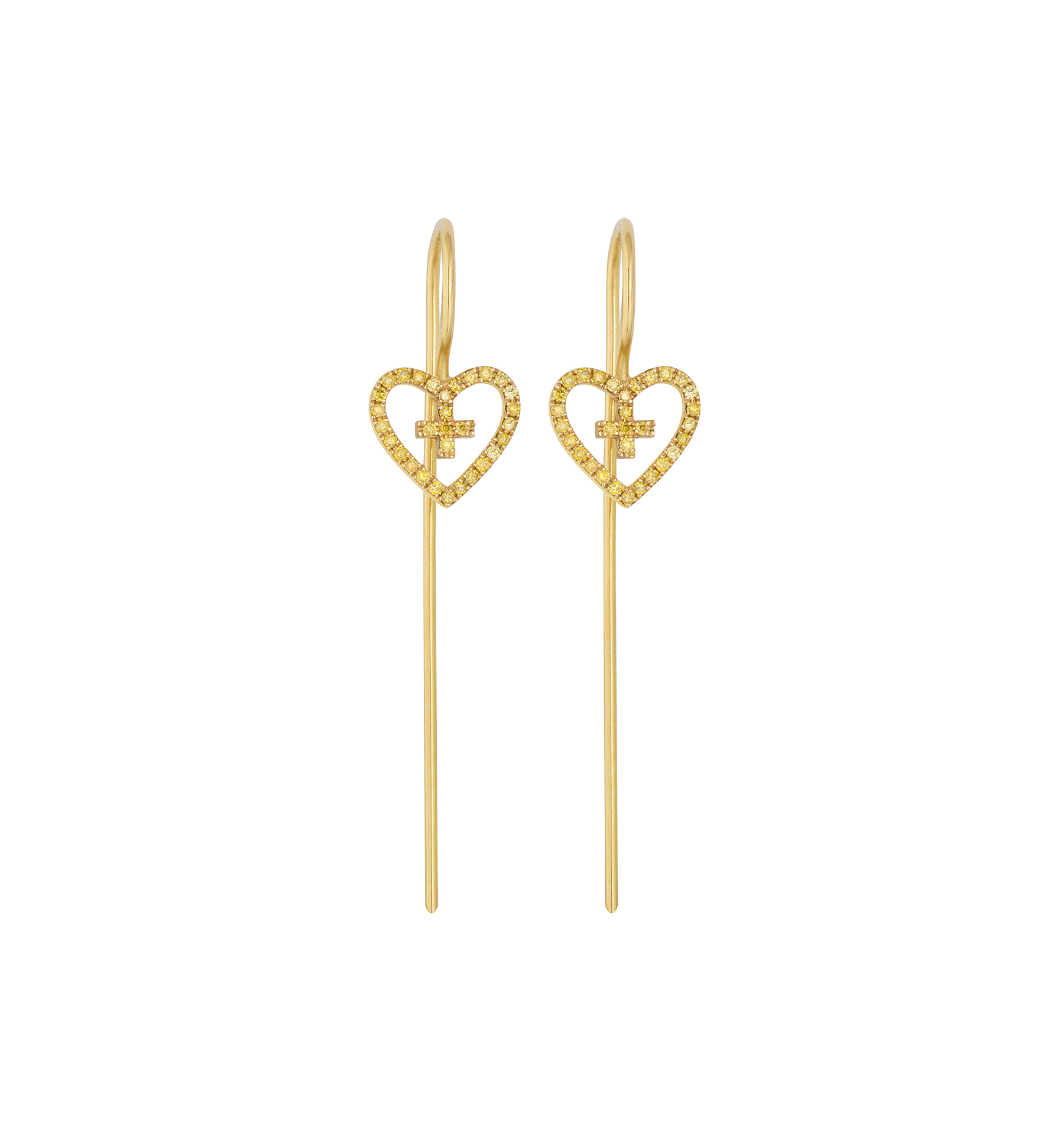 A pair of heart-shaped earrings featuring an integrated cross, exquisitely set with yellow diamonds. This design embodies love and protection, celebrating self-love while offering a subtle symbol of daily guardianship. Minimalist yet elegant, these earrings are a timeless statement of grace and meaning.