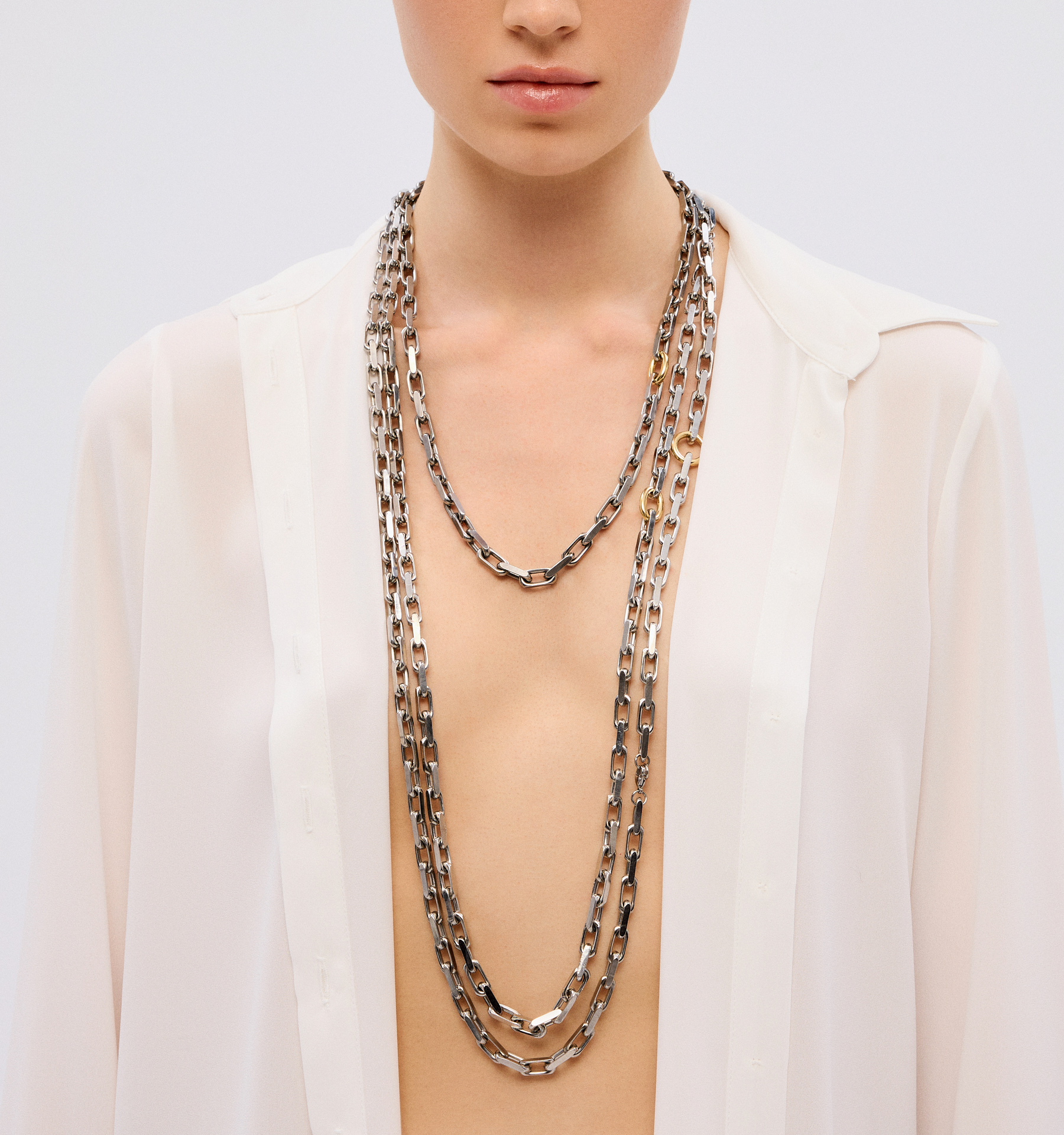Stainless steel chain featuring a single oval gold link, creating a striking contrast. Bold, strong, and powerful, this chain makes a statement and elevates any look with a notable presence.