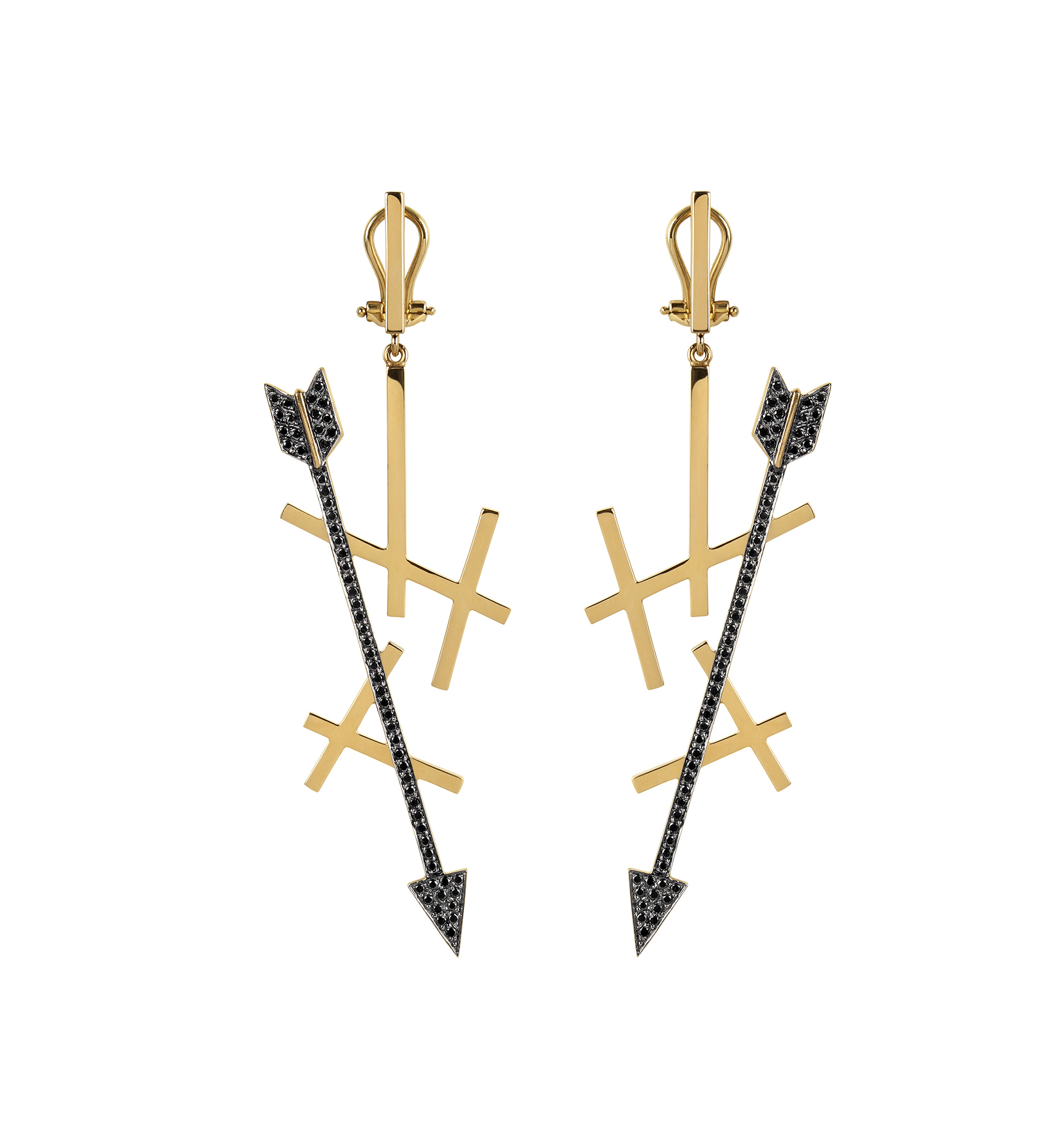 Crafted in gold, these sculptural drop earrings reinterpret the arrow as a symbol of love, direction, and quiet strength. Black diamonds trace the shaft and wings, adding depth, contrast, and a subtle sparkle that moves with you. A modern statement piece that feels both bold and refined — designed to stand out effortlessly, day or night.