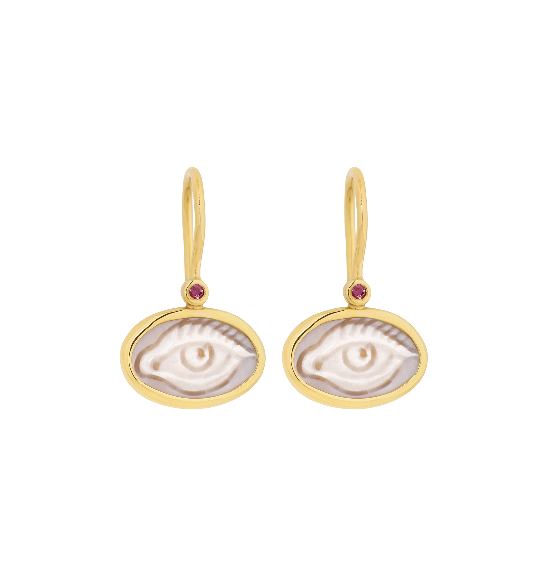 Gold earrings from the Hand Carved collection. Bas-relief of eye carved on a shell, each one of a kind, each pair unique. EVIL EYE: A symbol that since Greek antiquity has acted as a deterrent to all evil and at the same time protectively, bringing luck and prosperity.